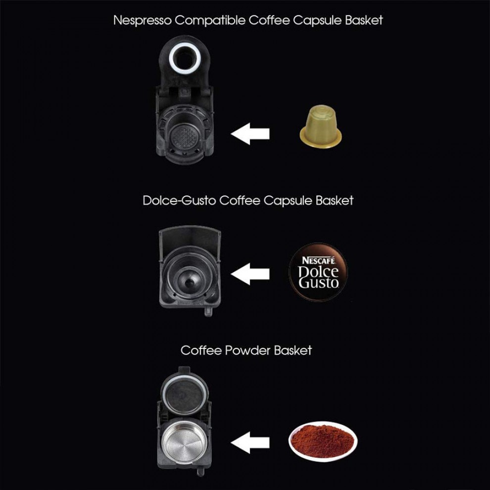 • ☕ أنواع القهوة المتوافقة: كبسولات نسبريسو®، دولتشي غوستو®، والقهوة المطحونة